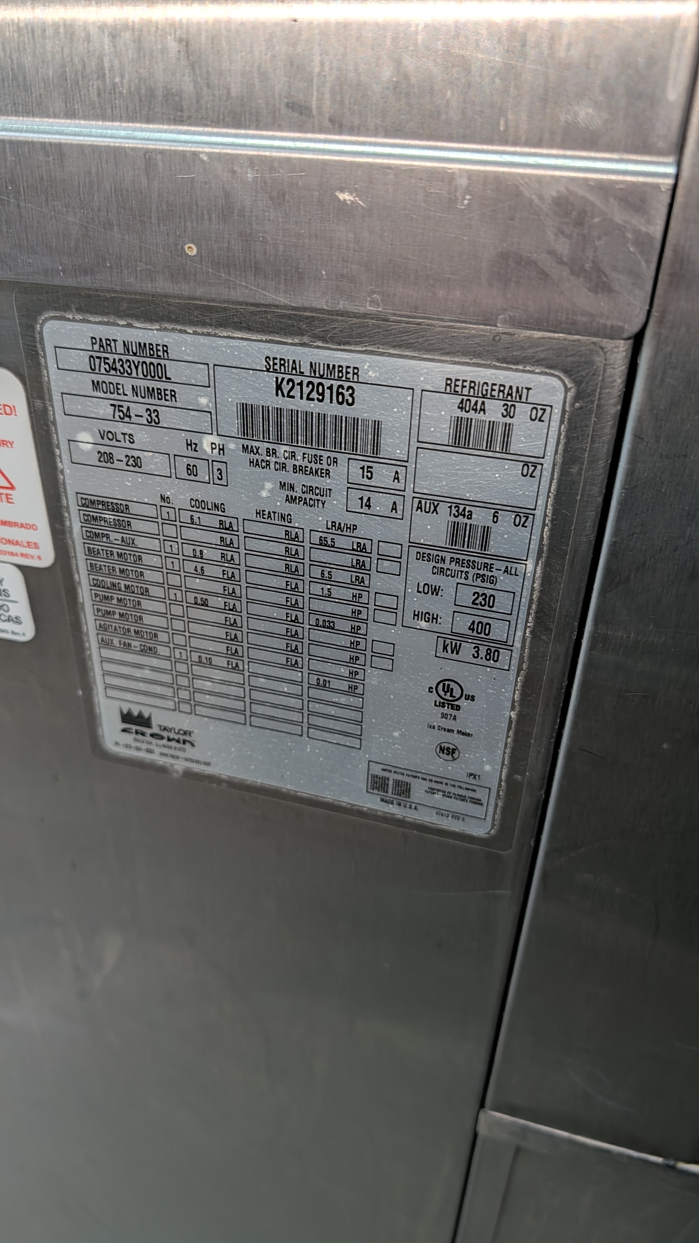 Selling a used Taylor 754-33 ice cream machine. Machine is 3 phase power, water cooled. In great working condition. Unit comes with power cables, brand new tune up kit, hopper seal, brush cleaning kit. Local pickup only. Willing to demo unit before purchase if needed. I have hooked up the machine 1/23/26 and it is working as expected.