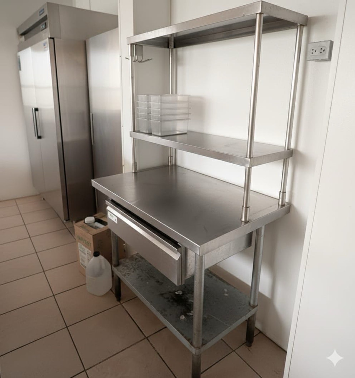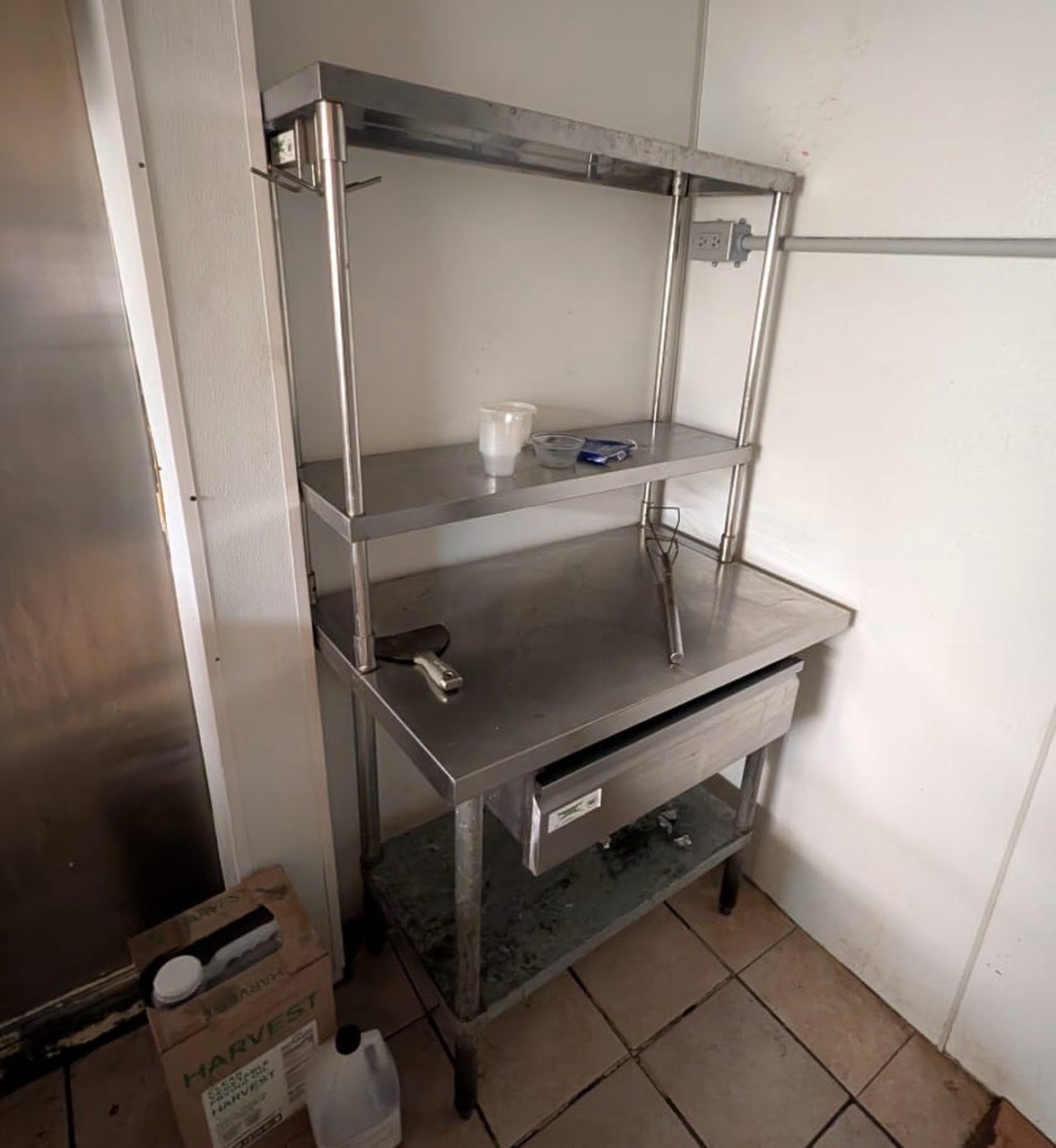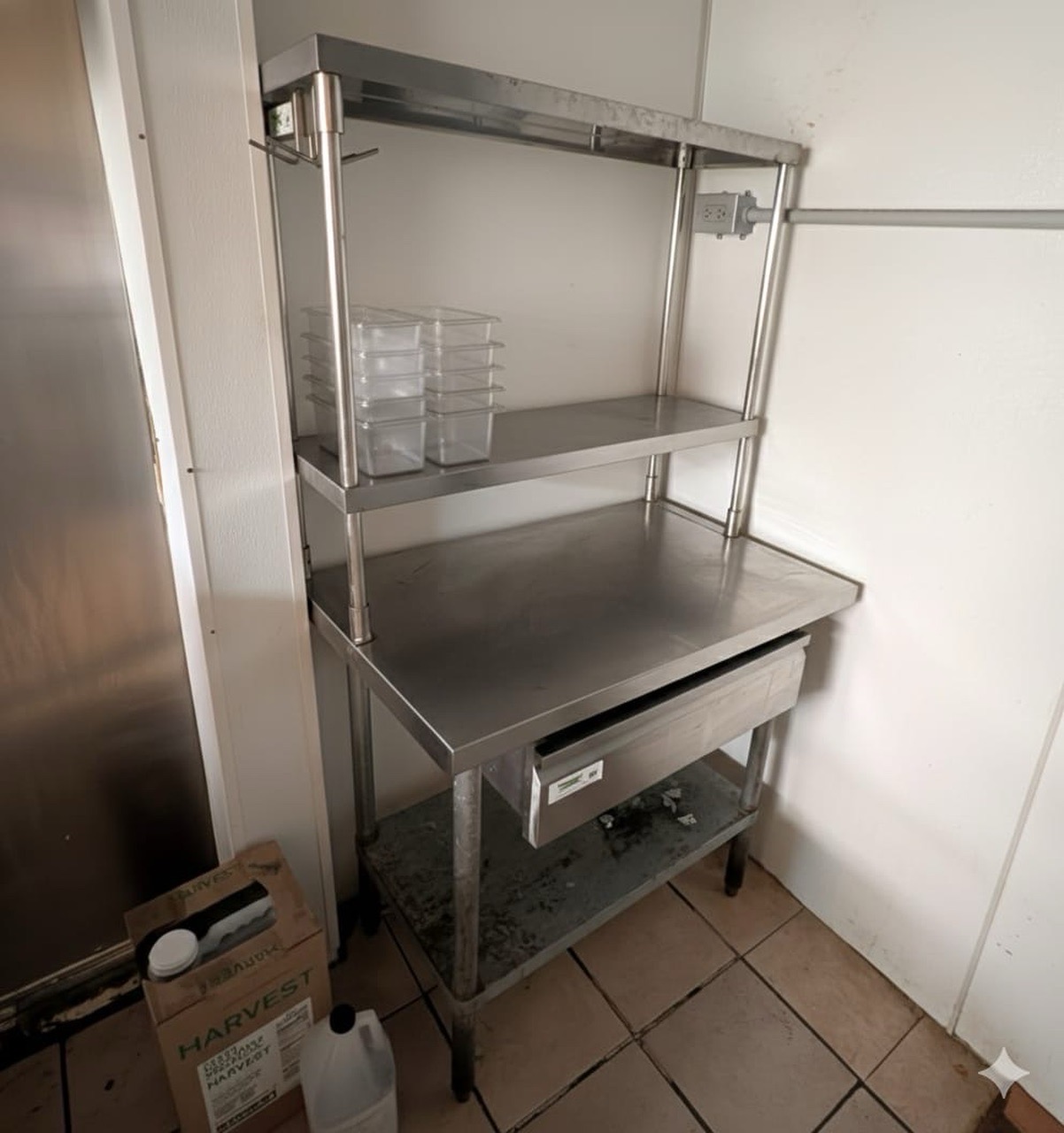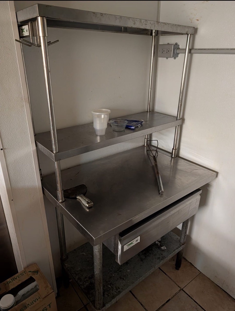 Professional-grade stainless steel kitchen workhorse. This is a complete preparation station, perfect for restaurants, cafes, or a high-end home garage/outdoor kitchen setup. * Dimensions: 48" Length x 30" Depth. * Storage: Includes a 2-tier adjustable stainless steel overshelf for easy access to spices, tools, or tickets. * Features: Heavy-duty sliding stainless steel drawer and a full-length adjustable bottom undershelf. * Condition: Used, solid industrial construction. Shows some character/wear consistent with a busy kitchen, but it is structurally sound and ready for work. Price: $350 OBO Pickup: Must be able to haul; legs/shelves can be detatched for easier transport with an allen wrench.