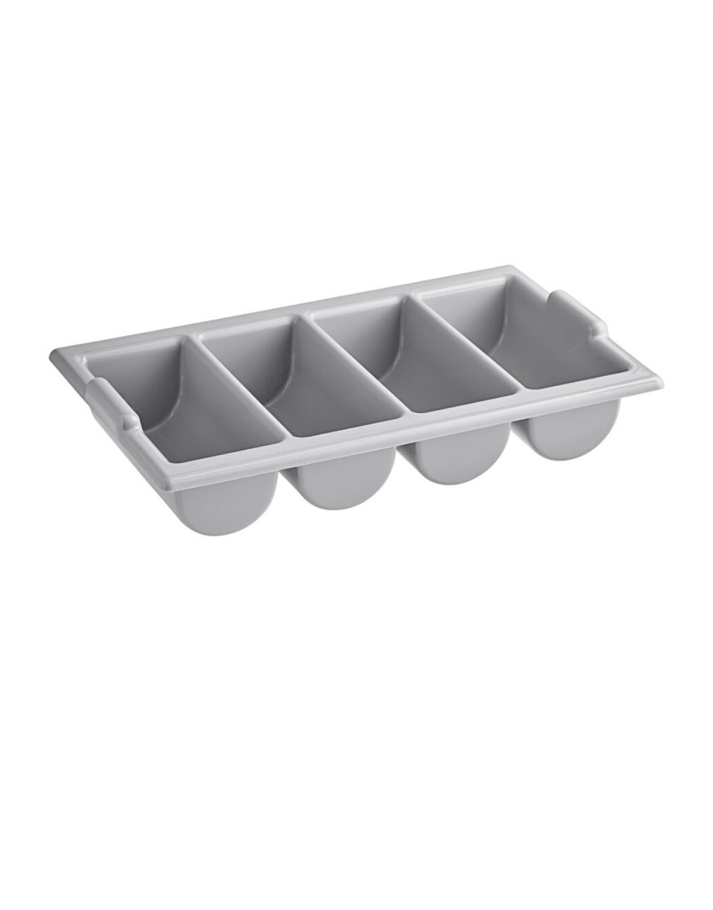 This heavy-duty, 4-compartment plastic cutlery bin is designed for high-volume commercial use. Its durable, one-piece construction is built to withstand the rigors of a busy dining room or dish room. The rounded interior corners prevent food trap-points, making it easy to sanitize, while the integrated handles allow for secure transport even when fully loaded with silverware. Perfect for organizing forks, spoons, and knives at a self-service station or for efficient sorting in the back of the house.