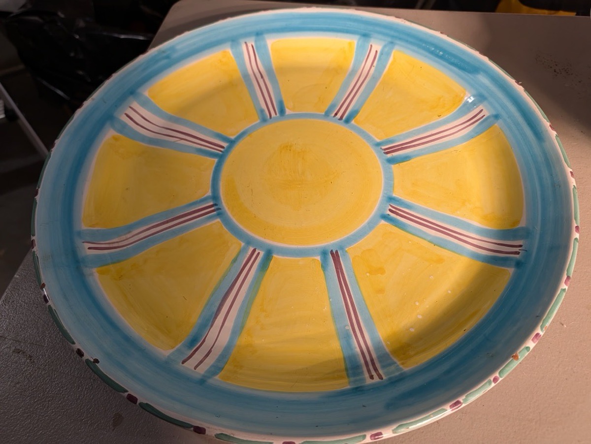 Beautiful oversized round ceramic serving platter featuring a vibrant hand-painted sunburst design in yellow, turquoise blue, and soft accent striping. This piece has a cheerful Mediterranean / Tuscan feel and makes a striking centerpiece for serving salads, pasta, fruit, or shared appetizers.