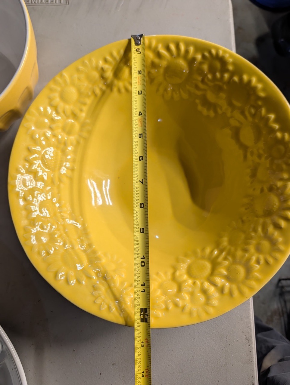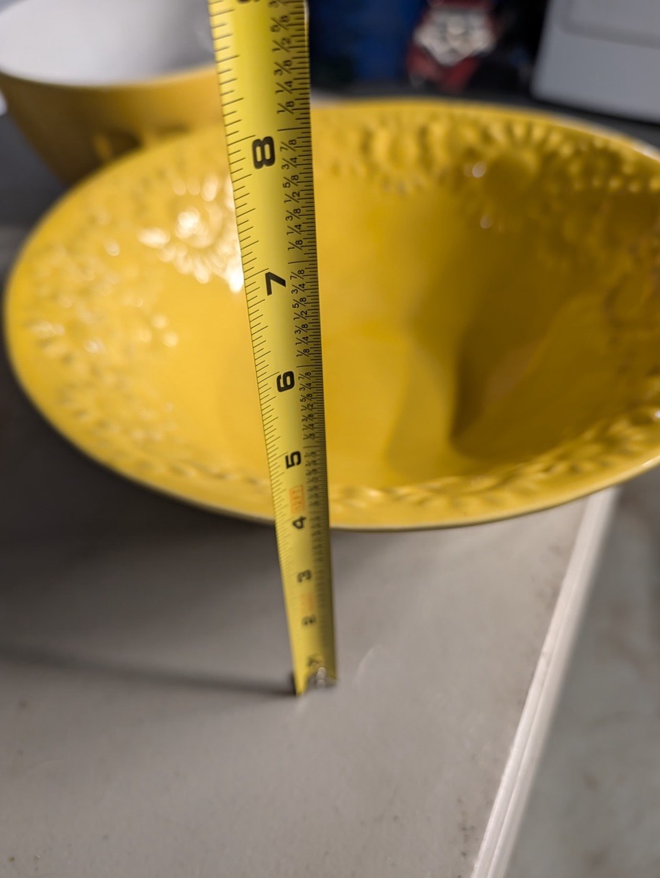 Beautiful hand-painted ceramic serving bowl made in Portugal, featuring a rich sunflower-yellow glaze with raised floral embossing around the rim. This bowl has a glossy finish and substantial weight, making it ideal for serving salads, pasta, fruit, or as a decorative centerpiece.