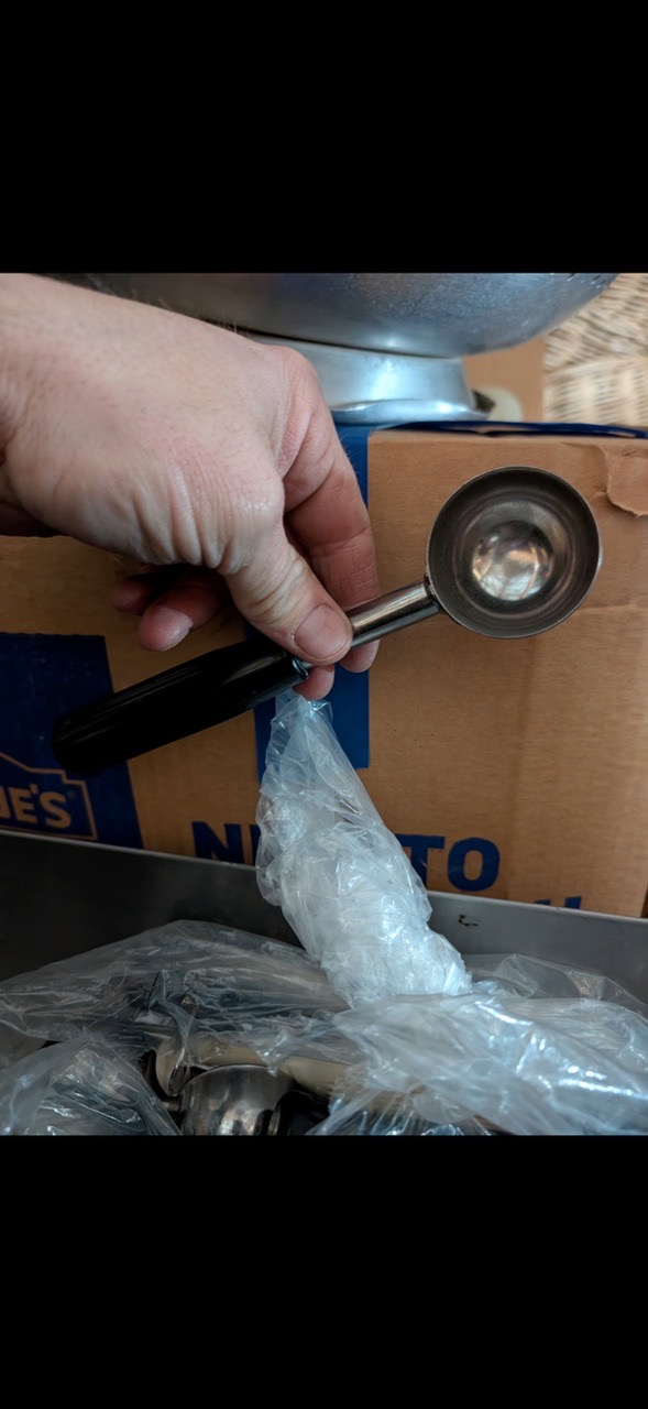 Heavy-duty stainless steel portion scoop with ergonomic black handle. Perfect for consistent portion control in: • Ice cream service • Cookie dough • Muffin batter • Mashed potatoes • Deli salads • Catering operations Commercial-grade construction with solid bowl and reinforced handle connection. Designed for high-volume restaurant and bakery use. Condition: Structurally solid and ready for service.