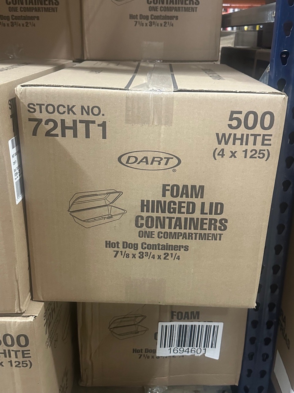 Keep your hot dogs fresh and secure with these foam hinged lid containers. Ideal for food vendors and events.
