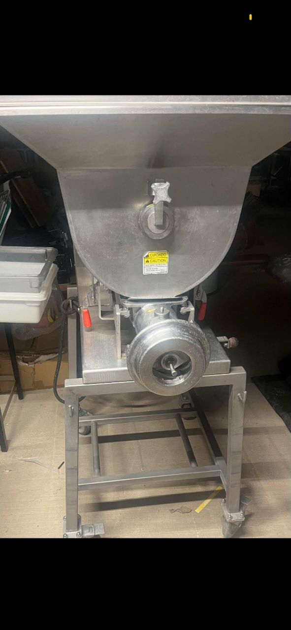 Product Overview Powerful 7 1/2 hp motor processes up to 3,900 lb. of meat per hour Stainless steel body, tray, and headstock for durability and longevity Features pneumatic piston and electromagnetic safety sensors on lid 4 casters for effortless transport Simple disassembly for ease of cleaning